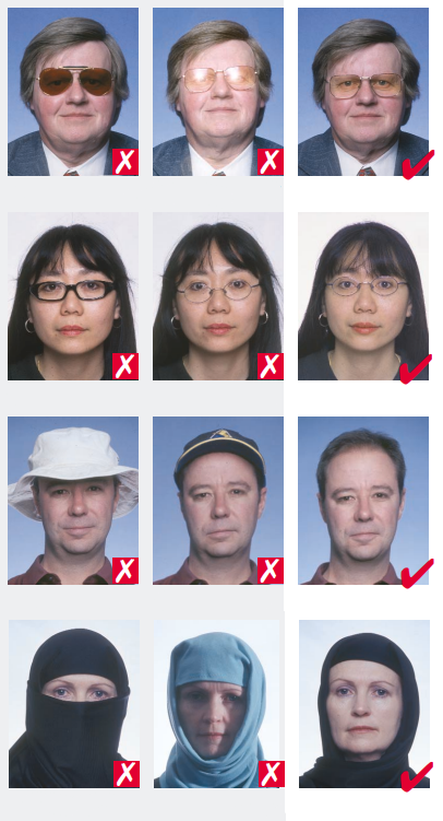 * No hat or cap - the face area must be clearly visible. Hats or caps are not allowed except for religious reasons. In those cases, veils, scarves, or head coverings should be handled carefully so as not to obscure any facial features or create shadows.