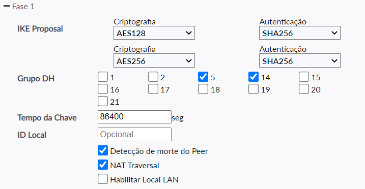* **Diffie-Hellman Group:** Selecione os grupos apropriados (ex: 14, 5).