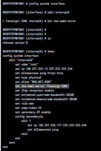 Para habilitar a autenticação EAP (Extensible Authentication Protocol), necessária para a integração SAML, execute os seguintes comandos na CLI do FortiGate: