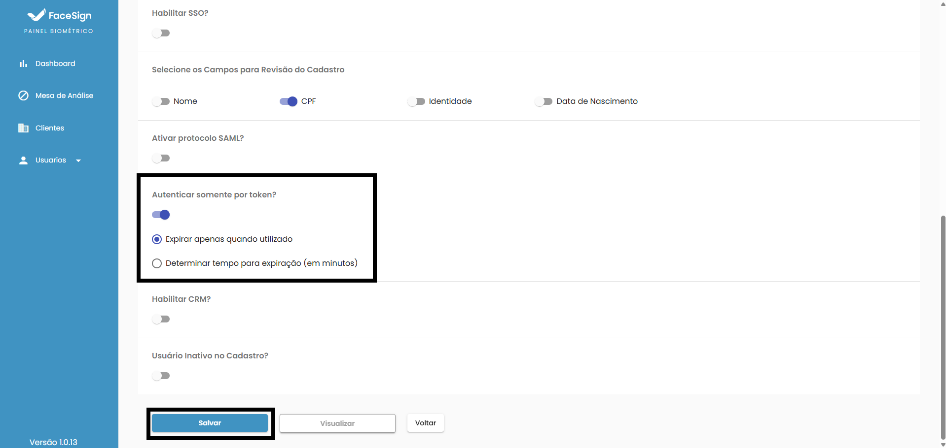 Selecione o modo como o token expira e salve as alterações: